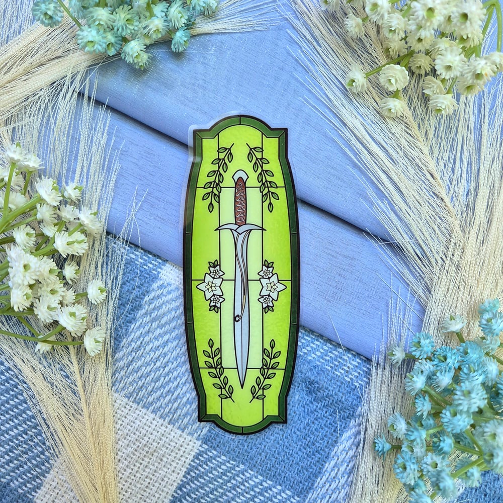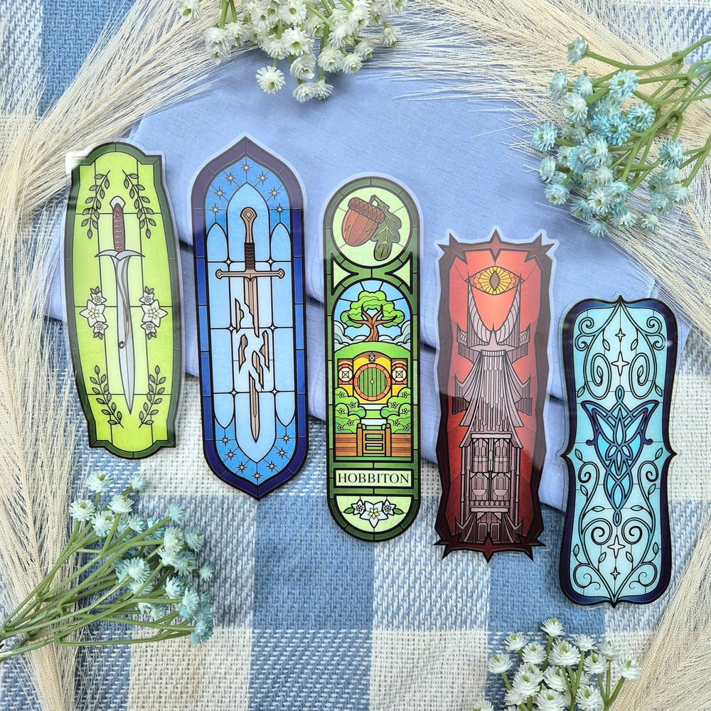 Five Lord of the Rings inspired stained glass window style bookmarks, available individually or as a set of 5. Designs include Bilbo's sword Sting, Hobbiton, The Eye of Sauron tower Barad-Dur, the shards of Narsil, and Arwen's jewel The Evenstar.